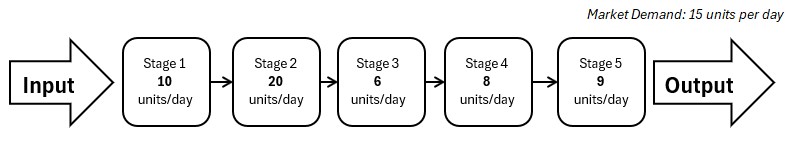 Now, suppose we strengthened the weakest link by double — increasing the capacity of Stage 3 to 12 units per day. What happened to the whole chain? It became stronger (throughput increased), but now another link is the weakest, and the chain’s capabilities are limited by the strength of that link. In our case, this will be Stage 4.
